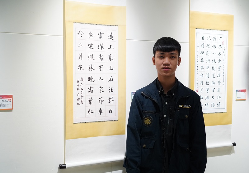 本次書法類特優的司同學,雖然家中為低收入戶,經濟狀況困難,但他從小就對書法充滿熱情。為了練好字,他常利用課餘時間勤練,一筆一劃都不馬虎。即使過程辛苦,也從未想過放棄。多年來,他參加多場比賽並屢獲佳績。這次以作品〈山行〉脫穎而出,筆觸穩健、氣韻深厚,充分展現他長年努力的成果與對書法的熱愛。