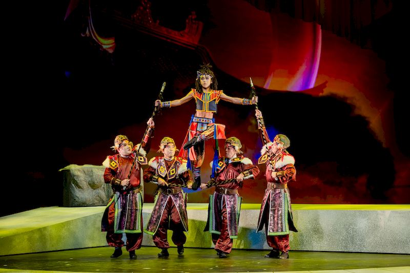 人間的愛恨與陰間的宿命,亦透過服裝的色彩與線條,在舞台上對話。隸屬聖元族的將士們,身著厚實而嚴謹的白銀冷灰戰甲,閃爍著軍旅制度的冷峻;瀚海族的衣袍,則以奔放的橘、黃、藍等鮮明色彩,揮灑出不羈的民族性。當場景轉入陰間,灰黑與殘白成為主調,暗示著靈魂的斑駁與無常。主角趙霆翰死後,那身被鮮血浸染、永不褪色的鎧衣是英雄悲壯命運的最終定格,在淒美中綻放著忠義的重量。