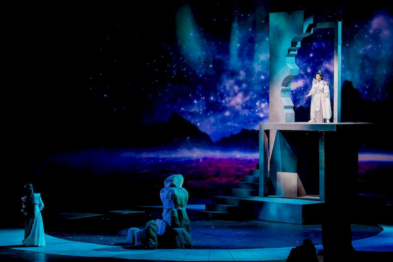 《忘川遙》以陰陽兩界跨越一甲子的時空敘事,舞台設計以「環形輪迴流轉」為核心,運用歌劇院的旋轉舞台,配合佈景的升降與物件移動,流暢地呈現從人間愛戀到死後等待的時空流轉,演繹人生無常,構築業鏡、望鄉台、三生石、忘川河等臺灣傳統戲曲裡對幽冥境地的想像。