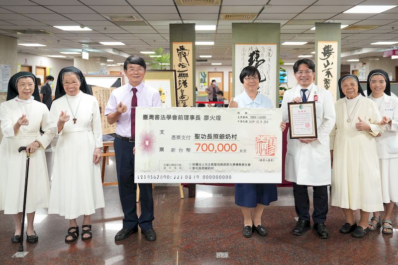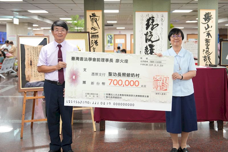 義賣墨寶所得共計新臺幣七十萬元,廖火煌理事長慨然全數捐贈予聖功修女會,作為籌建「聖功長照爺奶村」之用,盼以藝術凝聚愛心,為長者打造「安心、尊嚴、有愛」的安養家園。聖功醫療財團法人執行長楊儀華修女表示:「爺奶村是修女們多年來的心願,盼能提供長者兼具照護、尊嚴與社區共融的幸福生活。」廖理事長的義舉為修女們注入暖流,更期盼喚起民眾愛心以行動支持公益。