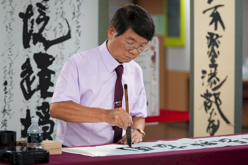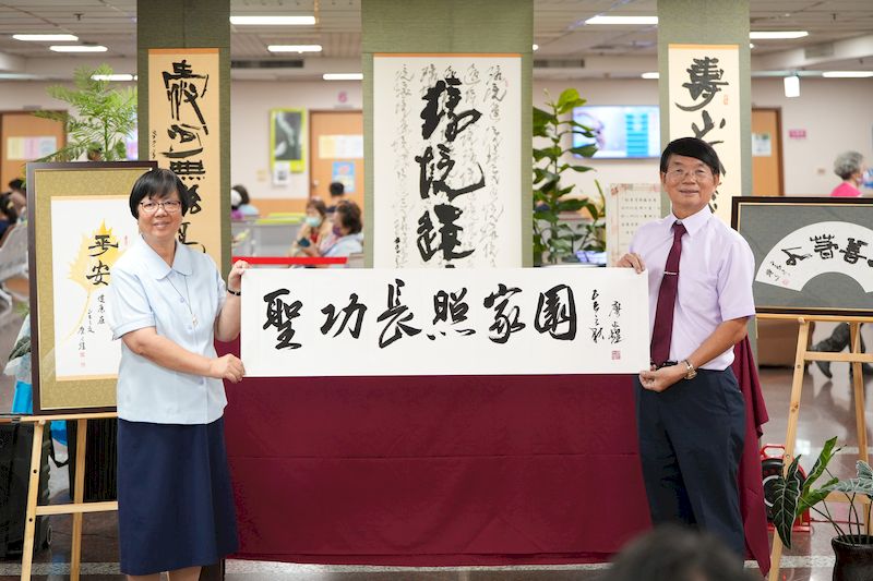 這場義賣源自「有愛同行—廖火煌古稀書法展」,展覽日前於高雄市文化中心至真二館盛大舉辦,吸引眾多貴賓、學者與書法愛好者參與。廖火煌理事長以「愛」為創作核心,作品風格溫潤沉靜、氣韻雋永,展現深厚書藝與人文關懷。展覽的契機,來自廖理事長夫婦偶然看到聖功修女會為籌建「聖功長照爺奶村」所拍攝的勸募廣告—「雨淋不熄,希望不滅,愛的進行式需要你接力」。畫面中修女們在風雨中勘查工地、堅定為長輩築夢的身影深深打動他們,因而決定以書法義賣拋磚引玉,為修女會籌建爺奶村盡一份心力。