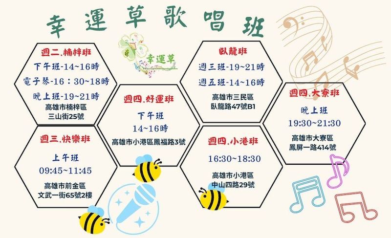 幸運草歌唱班成立以來,秉持「用音樂連結幸福」理念,從初期幾位熱愛歌唱的成員,發展至今日在南、北高雄設有多個據點,包括楠梓、三民、前金、前鎮、大寮、小港等地,打造完整的音樂人才養成體系。課程涵蓋流行、民歌、懷舊金曲及專業表演訓練,吸引眾多市民熱烈參與。